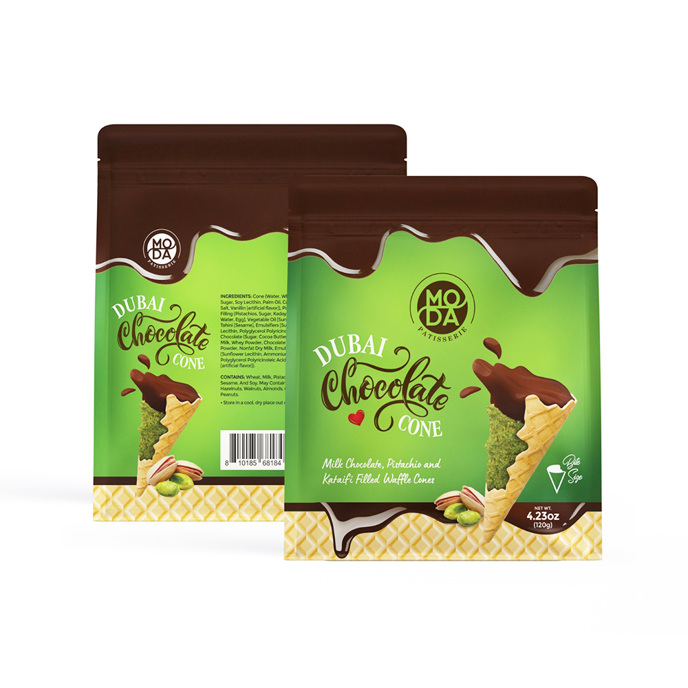 A premium chocolate cone inspired by the Dubai chocolate trend, featuring a pistachio-forward profile with creamy and crunchy textures. Well suited for seasonal programs, specialty assortments, and premium confectionery sections.