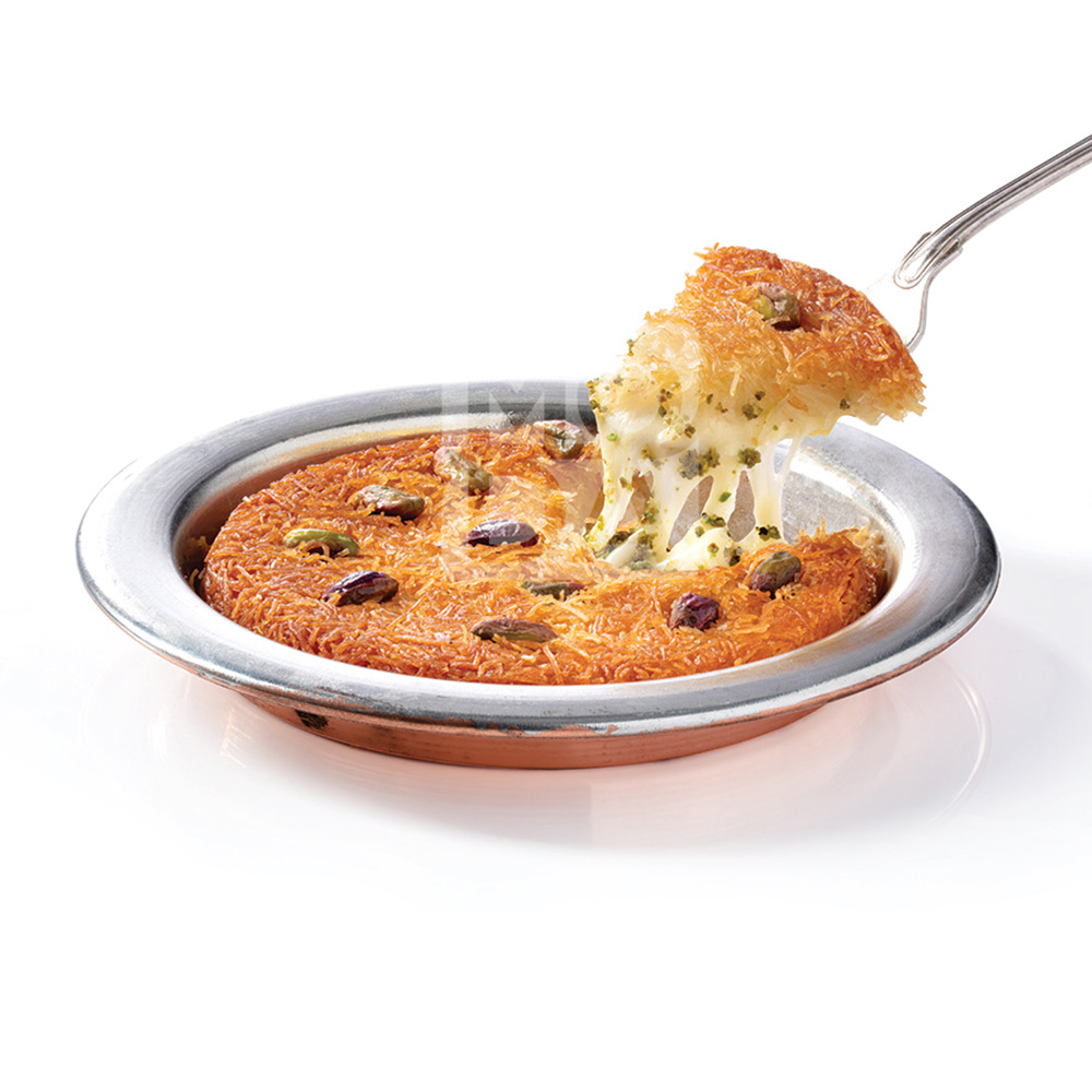 Künefe is a traditional Turkish dessert made with finely shredded pastry filled with melted cheese and baked to a golden crisp.